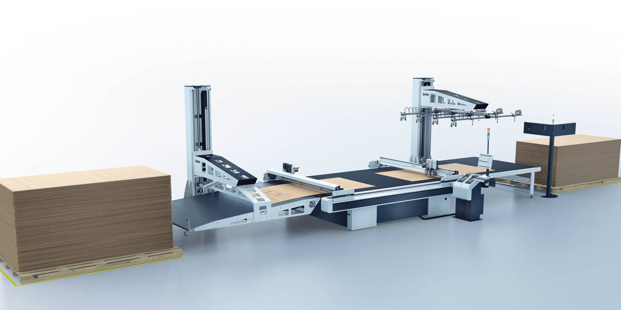 Vollautomatisierter Verarbeitungsprozess für Papier, Karton, Wellpappe, weiche Platten usw. 2 Arbeitsarme mit der Möglichkeit, bis zu 6 Arbeitsmodule und 6 Werkzeuge zu bestücken. Kameraerkennung der Schnittmarken von oben und unten.